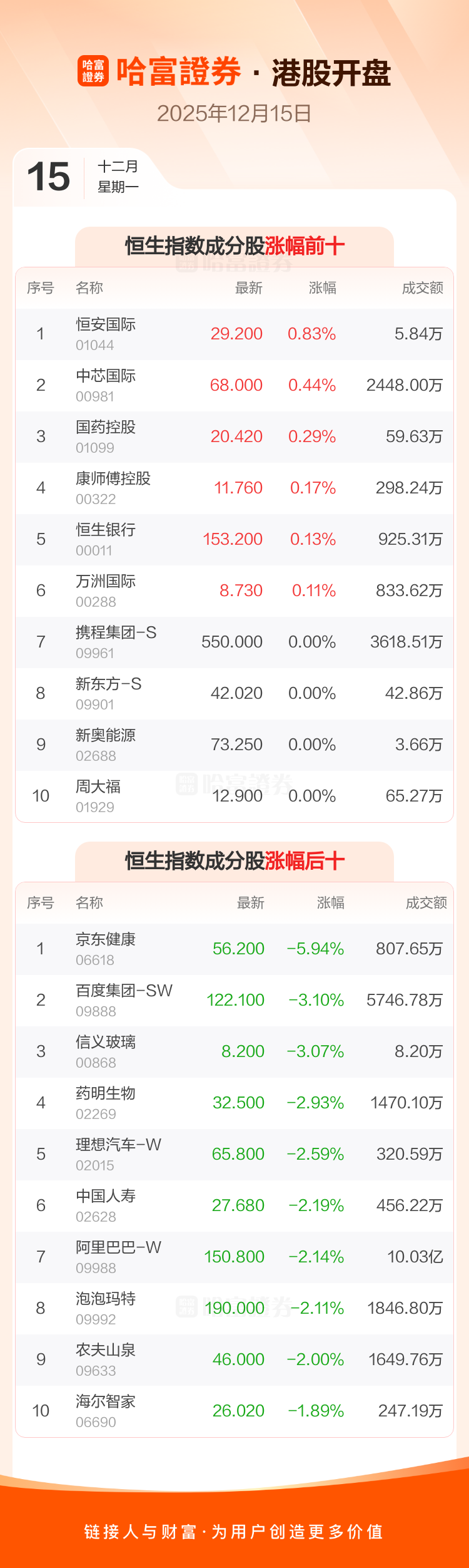 港股12月15日低开 ,恒生指数开盘报25718.14点,跌258.65点,跌幅1.0%;恒生科技指数开盘报5562.67点,跌75.38点,跌幅1.34%。恒生指数成分股中恒安国际、中芯国际、国药控股涨幅居前,京东健康、百度集团-SW、信义玻璃跌幅靠前。恒生科技指数成分股中中芯国际、金蝶国际、携程集团-S涨幅居前,京东健康、百度集团-SW、理想汽车-W跌幅靠前。