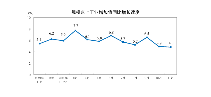 国家统计局:11月规模以上工业增加值同比实际增长4.8%