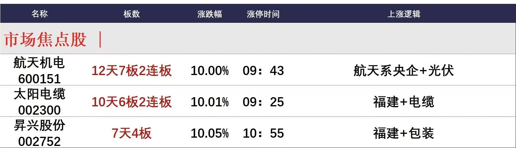 今日午盘全市场共51股涨停,连板股总数12只,26股封板未遂,封板率为66%(不含ST股、退市股)。焦点股方面,航天系央企集体走强,航天机电12天7板,航天信息、航天电子、乐凯胶片涨停;福建本地股局部活跃,太阳电缆10天6板、昇兴股份7天4板。