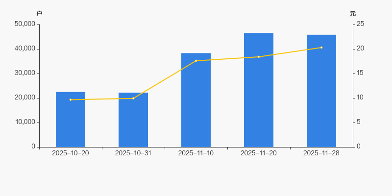 2025年10月20日至今,公司股东户数成倍增长,区间涨幅达104.04%。2025年10月20日至2025年11月28日区间股价上涨110.36%。
