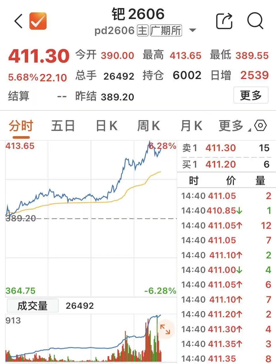 钯期货主力合约PD2606最高触及413.65元/克,涨超6%,逼近涨停(涨停板幅度7%)。PD2608、PD2610合约涨幅均在6%左右。