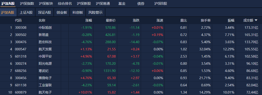 个股方面,南财金融终端数据显示,中际旭创全天成交额超173亿元居首,新易盛成交额超165亿元排名第二,胜宏科技、航天发展、中国平安的成交额均在100亿元以上。