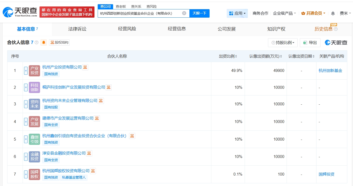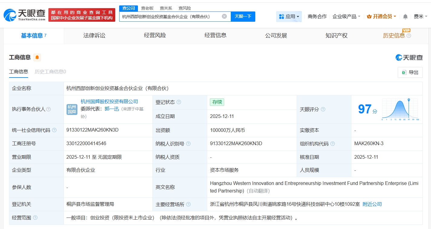 每经AI快讯,天眼查App显示,近日,杭州西部创新创业投资基金合伙企业(有限合伙)成立,执行事务合伙人为杭州国舜股权投资有限公司,出资额10亿元人民币,经营范围为创业投资,由杭州产业投资有限公司、桐庐科技创新产业发展投资有限公司、杭州资向未来企业管理有限公司等共同出资。