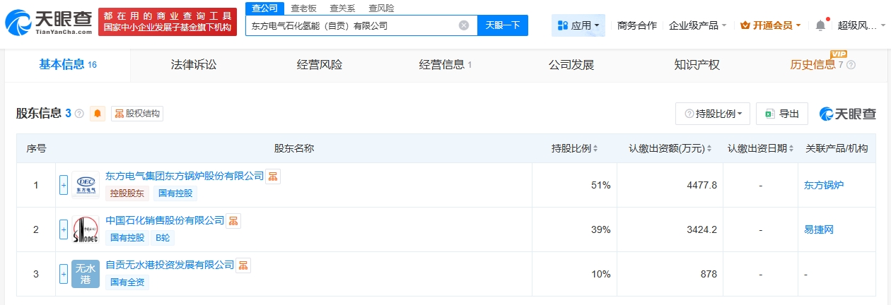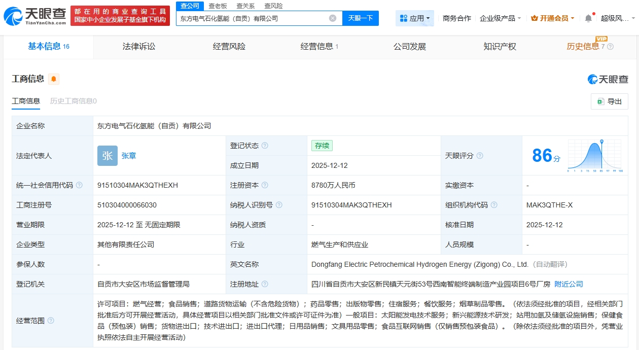 每经AI快讯,天眼查App显示,近日,东方电气石化氢能(自贡)有限公司成立,法定代表人为张章,注册资本8780万元人民币,经营范围包括燃气经营、食品销售、太阳能发电技术服务、新兴能源技术研发、站用加氢及储氢设施销售等。股东信息显示,该公司由东方电气集团东方锅炉股份有限公司、中国石化销售股份有限公司、自贡无水港投资发展有限公司共同持股。