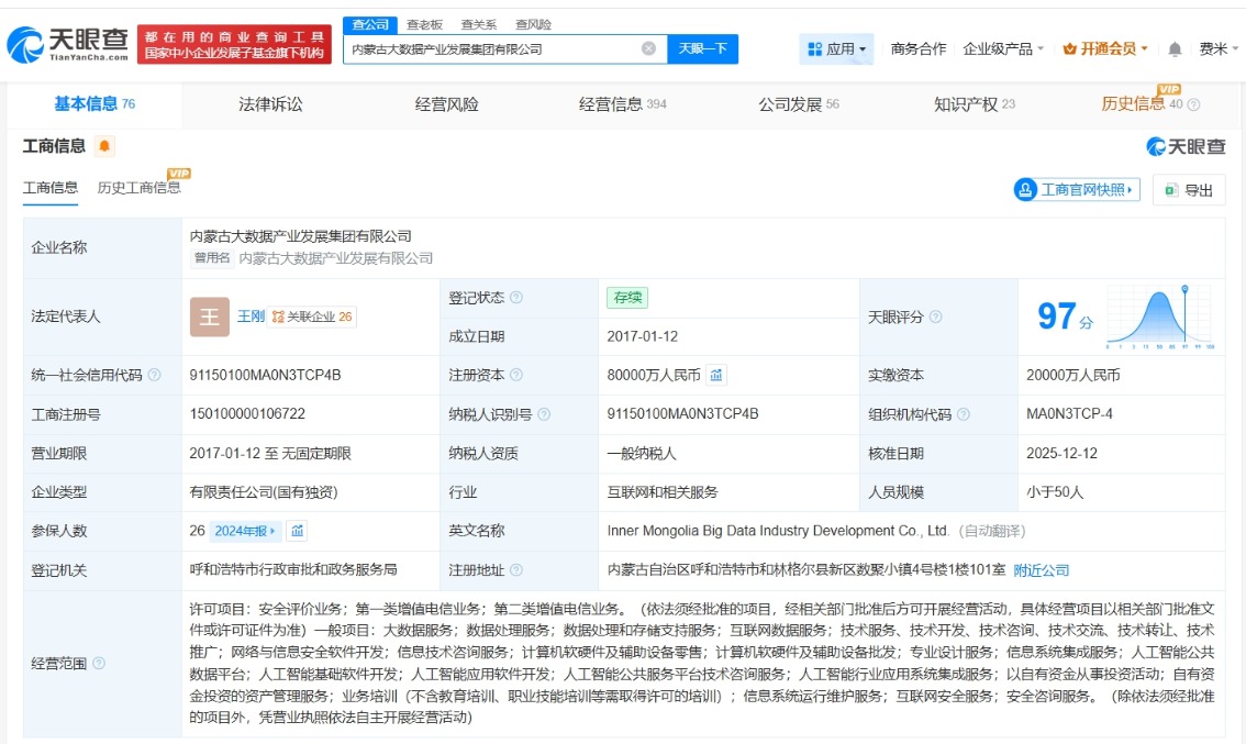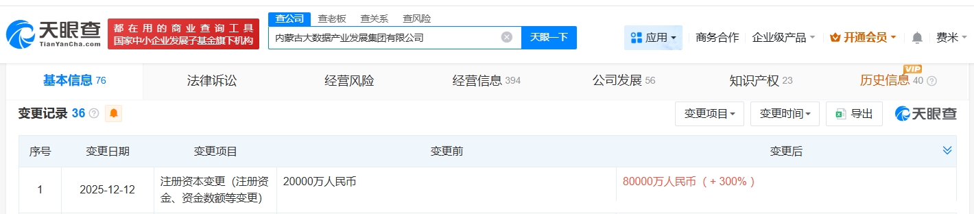每经AI快讯,天眼查App显示,近日,内蒙古大数据产业发展集团有限公司发生工商变更,注册资本由2亿元人民币增至8亿元人民币,增幅300%。该公司成立于2017年1月,法定代表人为王刚,经营范围包括安全评价业务、第一类增值电信业务、第二类增值电信业务、大数据服务等,由呼和浩特市国有资产监督管理委员会全资持股。