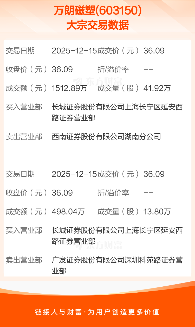 2025年12月15日,万朗磁塑发生2笔大宗交易,共成交55.72万股,成交金额2010.93万元,占其流通市值比例为0.65%