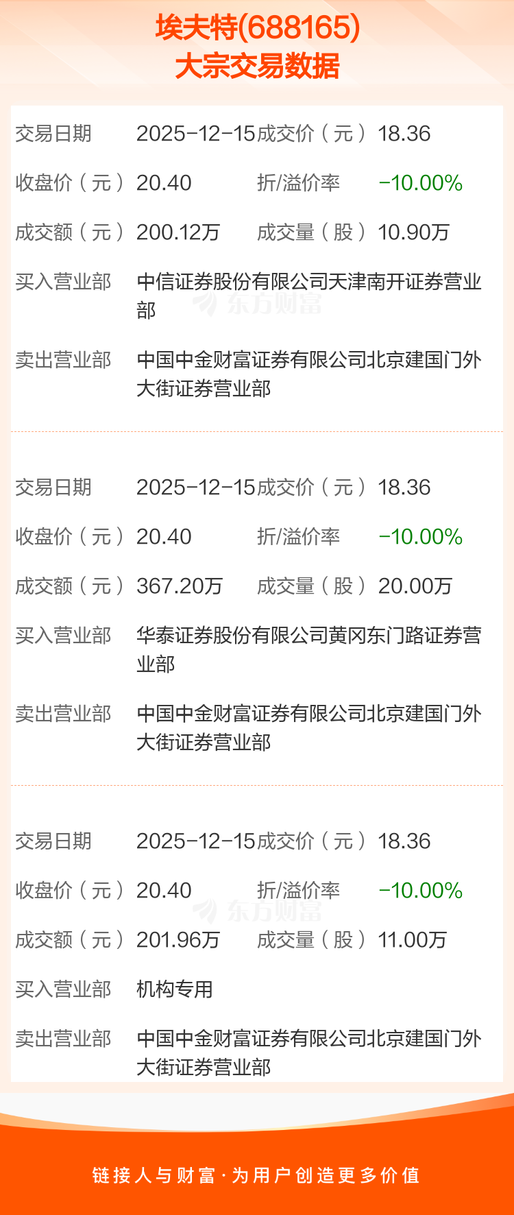 2025年12月15日,埃夫特发生3笔大宗交易,共成交41.90万股,成交金额769.28万元,占其流通市值比例为0.07%。