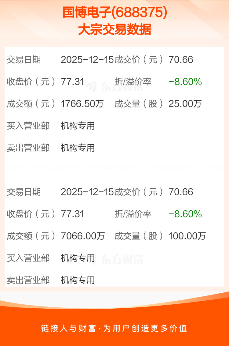 2025年12月15日,国博电子发生2笔大宗交易,共成交125.00万股,成交金额8832.50万元,占其流通市值比例为0.19%