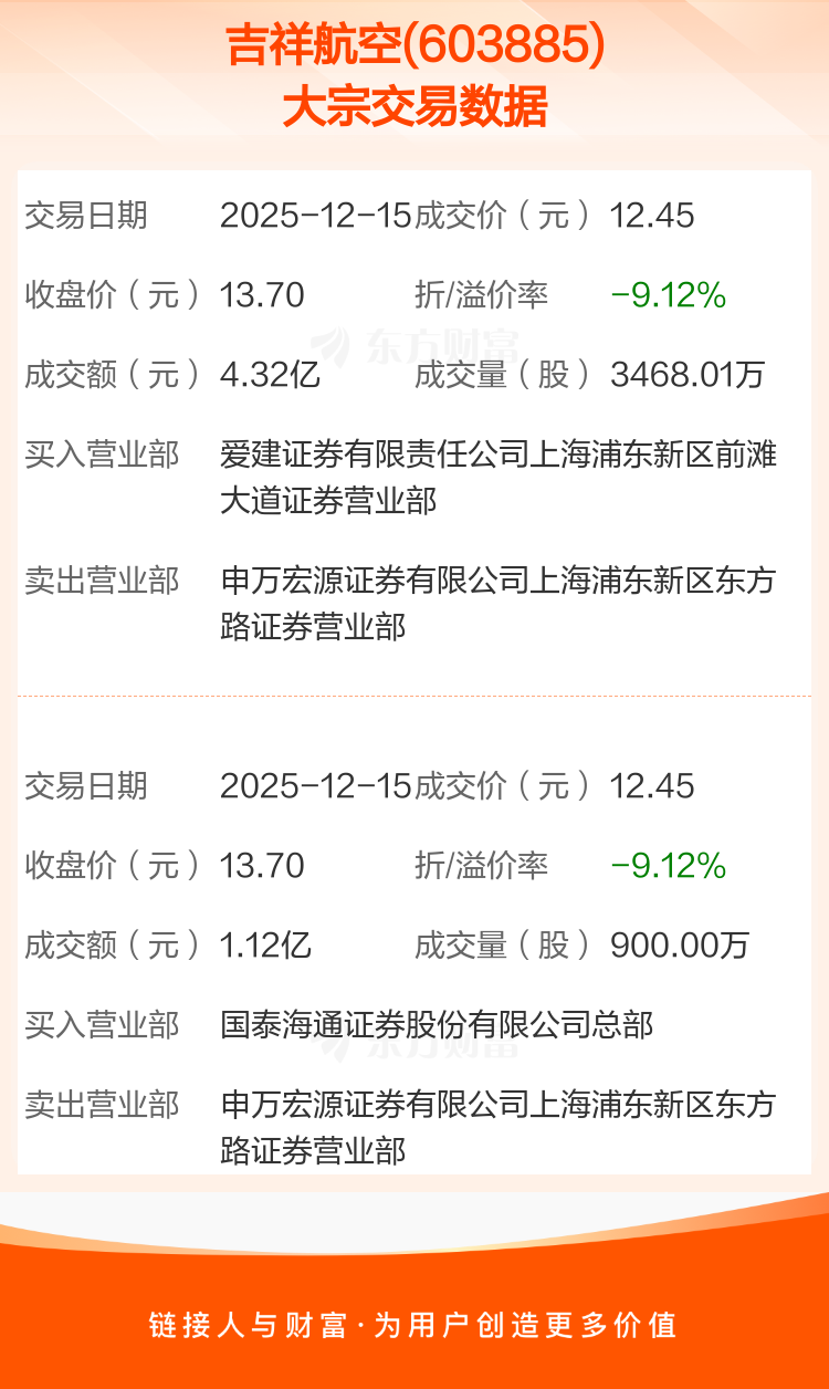 2025年12月15日,吉祥航空发生2笔大宗交易,共成交4368.01万股,成交金额5.44亿元,占其流通市值比例为1.82%。