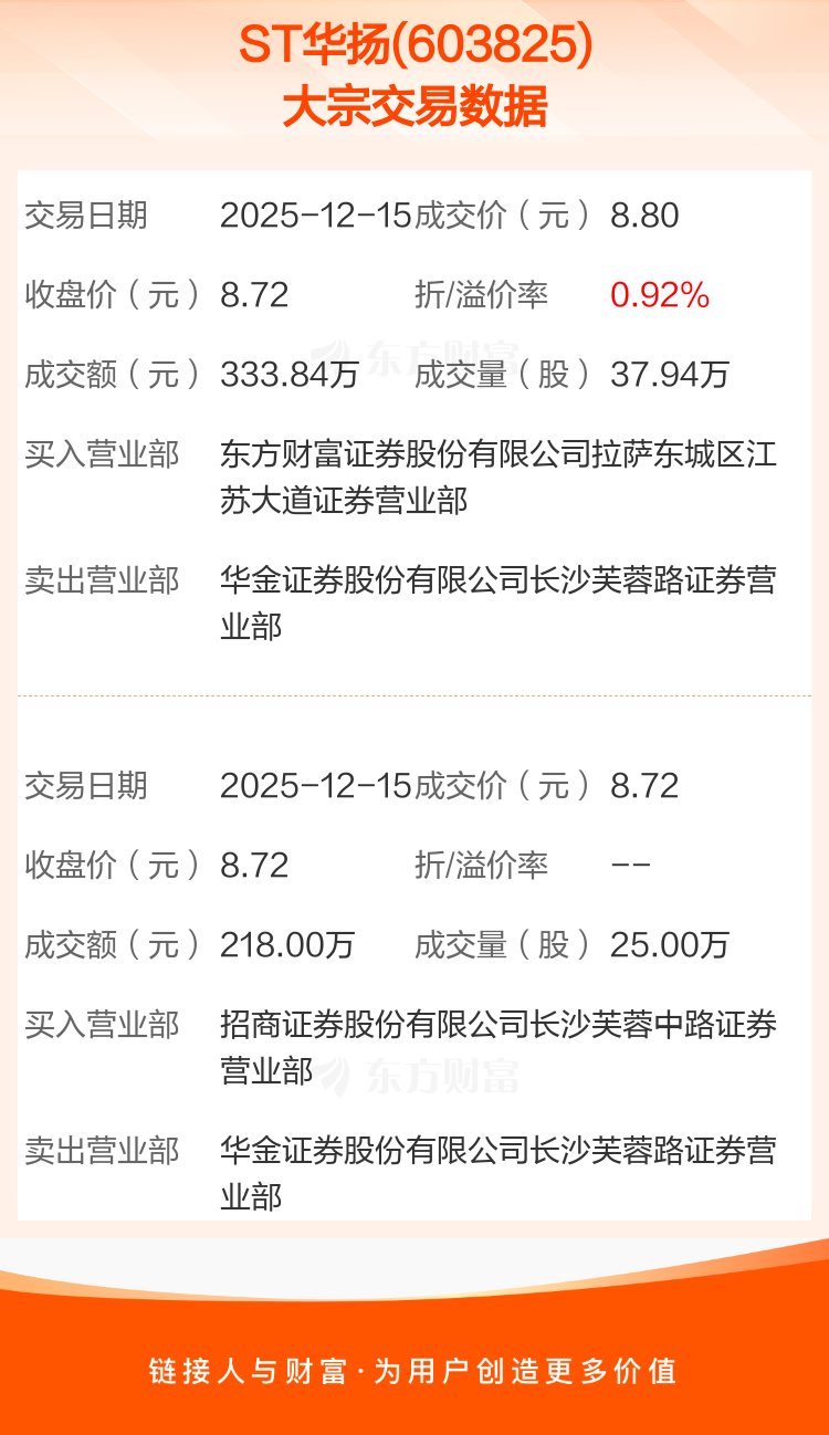 2025年12月15日,ST华扬发生2笔大宗交易,共成交62.94万股,成交金额551.84万元,占其流通市值比例为0.25%