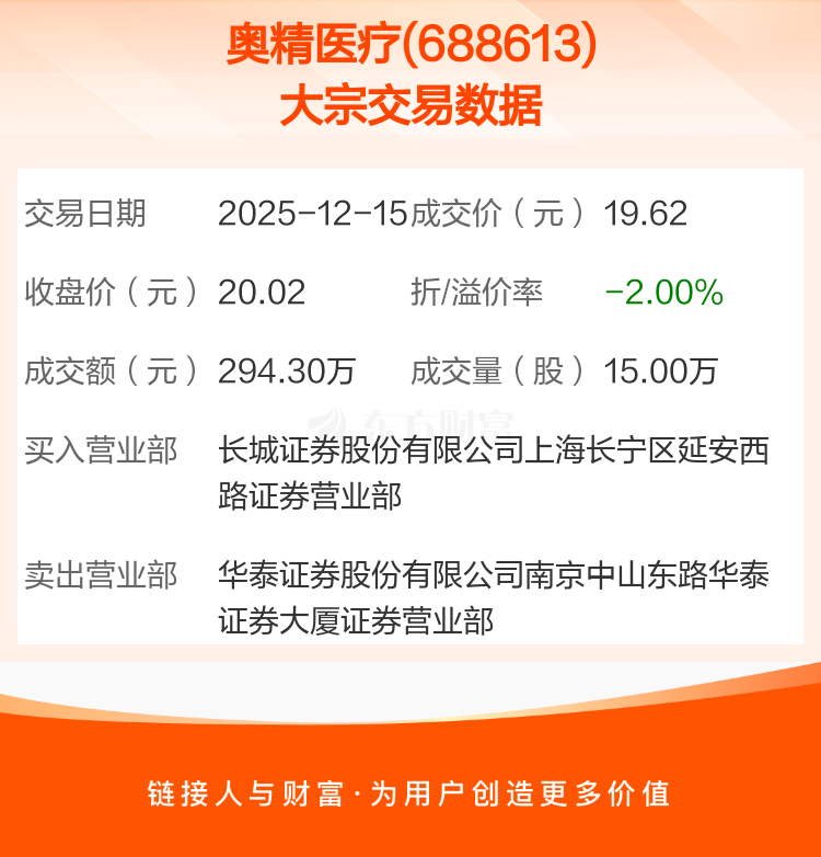 2025年12月15日,奥精医疗发生1笔大宗交易,共成交15.00万股,成交金额294.30万元,占其流通市值比例为0.11%