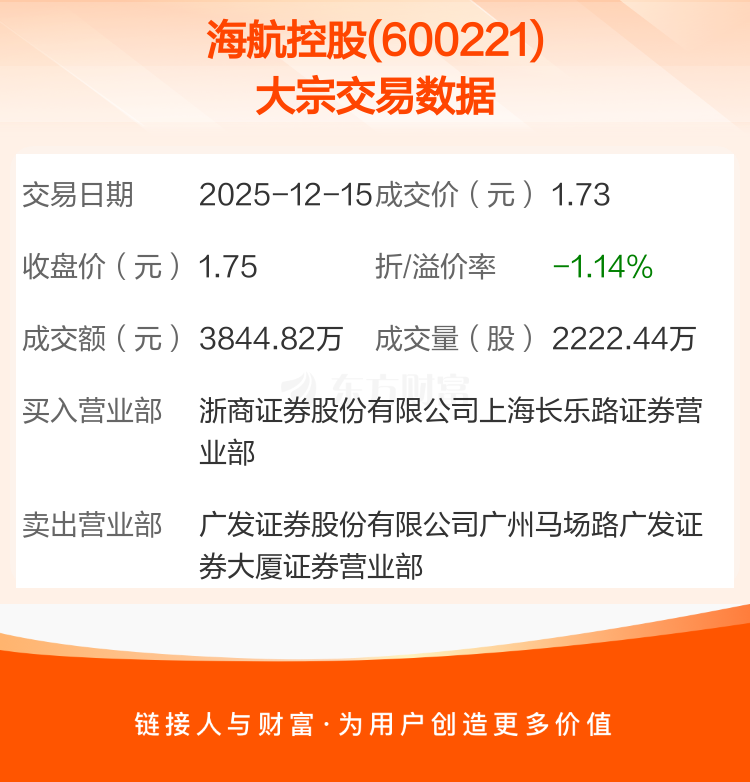 2025年12月15日,海航控股发生1笔大宗交易,共成交2222.44万股,成交金额3844.82万元,占其流通市值比例为0.07%