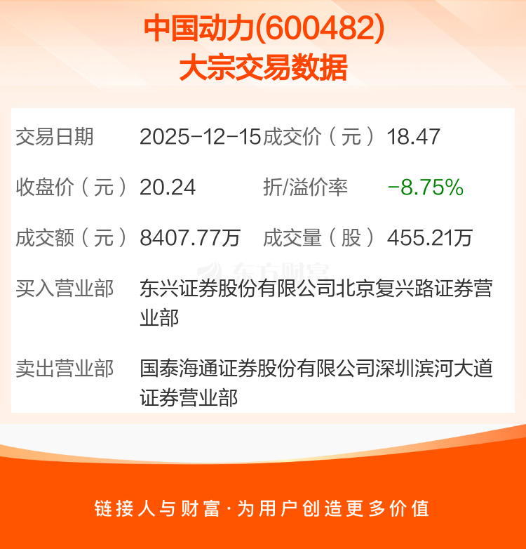 2025年12月15日,中国动力发生1笔大宗交易,共成交455.21万股,成交金额8407.77万元,占其流通市值比例为0.18%。