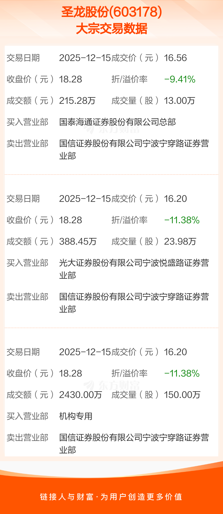 2025年12月15日,圣龙股份发生3笔大宗交易,共成交186.98万股,成交金额3033.73万元,占其流通市值比例为0.70%。