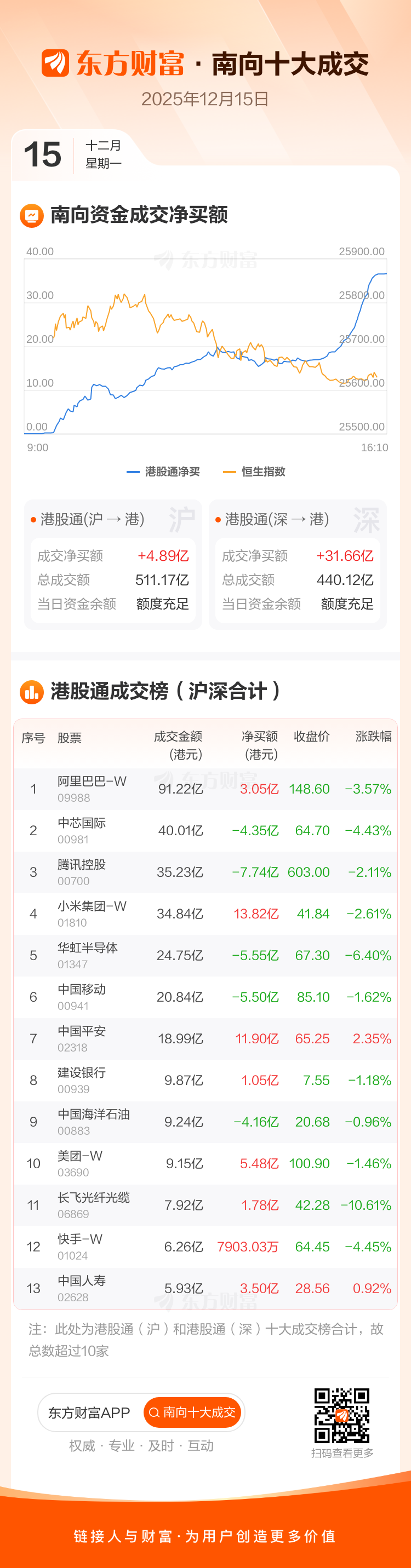 12月15日南向资金净买逾36亿港元,逾13亿抢筹小米集团-W