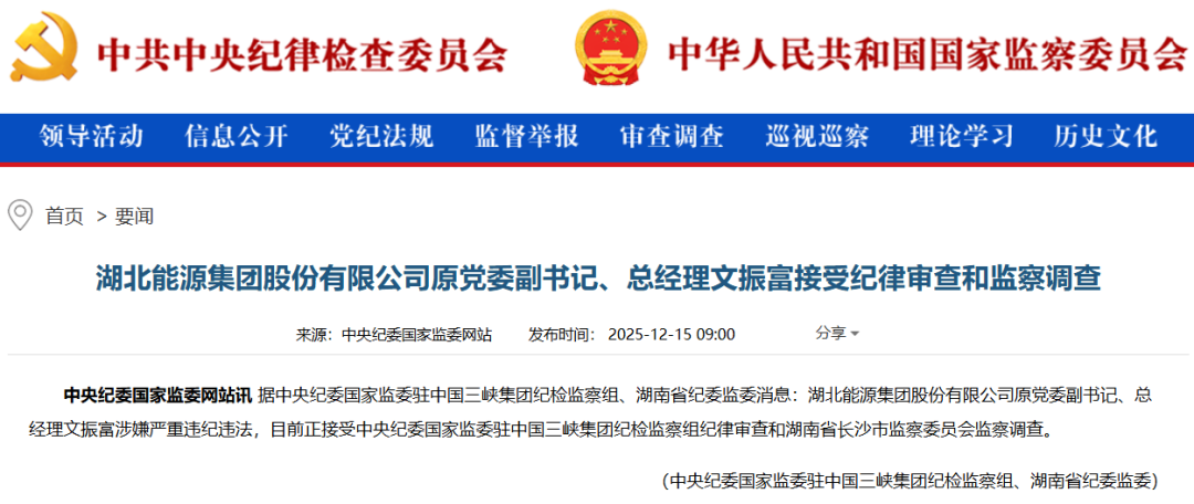 据中央纪委国家监委驻中国三峡集团纪检监察组、湖南省纪委监委消息:湖北能源集团股份有限公司原党委副书记、总经理文振富涉嫌严重违纪违法,目前正接受中央纪委国家监委驻中国三峡集团纪检监察组纪律审查和湖南省长沙市监察委员会监察调查。