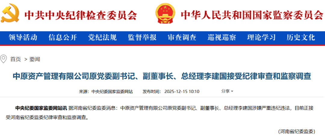 同日,据河南省纪委监委消息:中原资产管理有限公司原党委副书记、副董事长、总经理李建国涉嫌严重违纪违法,目前正接受河南省纪委监委纪律审查和监察调查。