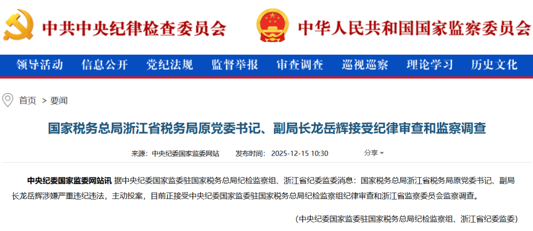 此外,据中央纪委国家监委驻国家税务总局纪检监察组、浙江省纪委监委消息:国家税务总局浙江省税务局原党委书记、副局长龙岳辉涉嫌严重违纪违法,主动投案,目前正接受中央纪委国家监委驻国家税务总局纪检监察组纪律审查和浙江省监察委员会监察调查。