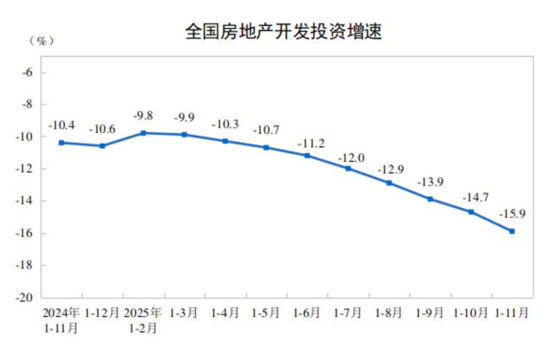 12月15日,国家统计局发布2025年1-11月份全国房地产市场基本情况的数据。其中,1-11月,全国房地产开发投资7.86万亿元,同比下降15.9%;新建商品房销售额7.51万亿元,下降11.1%。值得关注的是,截至11月末,商品房待售面积7.53亿平方米,比10月末减少301万平方米,今年以来连续9个月减少。