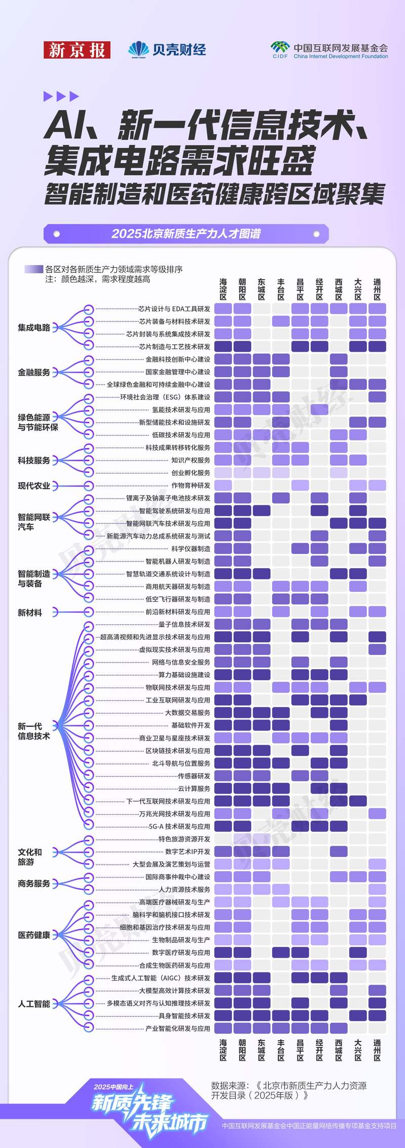 新京报贝壳财经记者梳理《目录》发现,海淀与朝阳在人才重点需求区域中出现频率最高,分别覆盖了58个新质生产力核心领域中的57个,既涉及具身智能、脑机接口、智能驾驶、6G研发等前沿技术,也延伸至知识产权、商事仲裁等配套服务,产业链条完整。