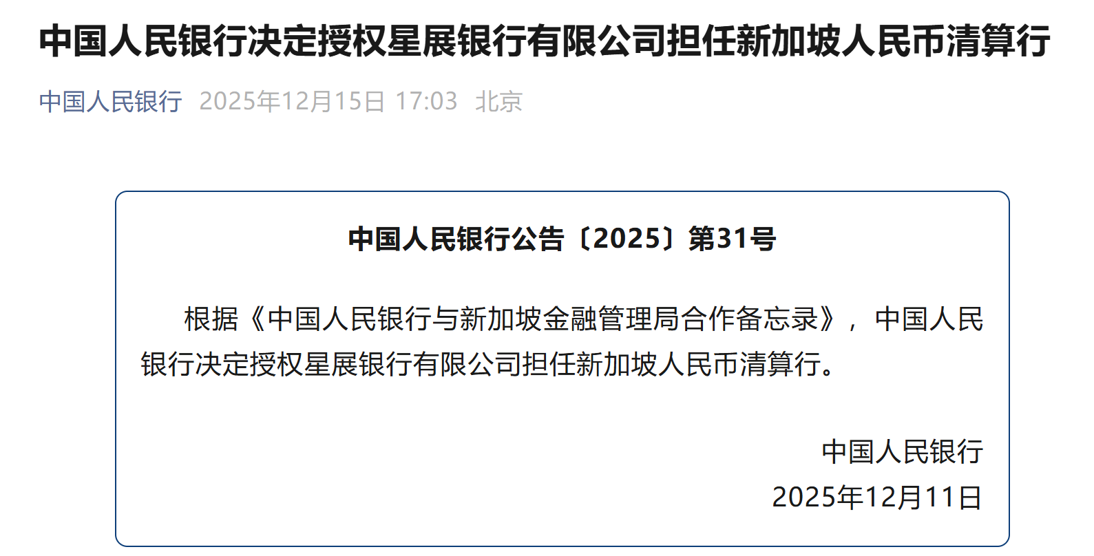 12月15日,中国人民银行发布公告称,根据《中国人民银行与新加坡金融管理局合作备忘录》,决定授权星展银行有限公司(下称“星展银行”)担任新加坡人民币清算行。