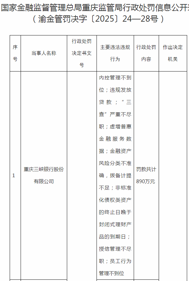 12月12日,重庆金融监管局披露的罚单显示,重庆三峡银行因内控管理不到位;违规发放贷款;“三查”严重不尽职;虚增普惠金融服务数据;金融资产风险分类不准确,拨备计提不足;非标准化债权类资产的终止日晚于封闭式理财产品的到期日;授信管理不尽职;员工行为管理不到位等,被罚款共计890万元。