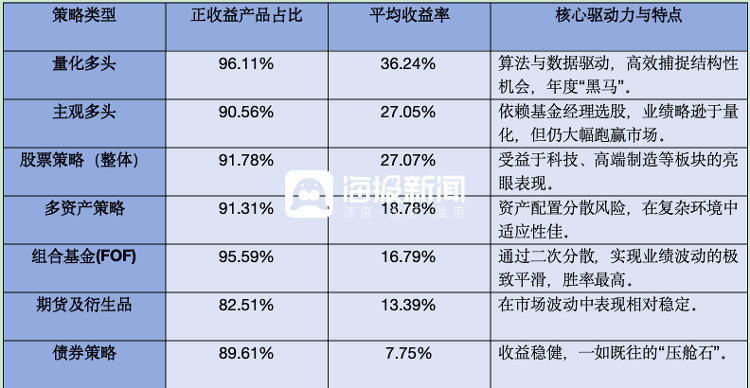 根据私募排排网数据,截至2025年11月底,私募证券产品展现出极强的盈利能力和高胜率,超过九成实现正收益,平均收益率达22.61%。其中,股票策略表现最为抢眼,平均回报27.07%,量化多头策略更是以平均36.24%的收益成为年内最大赢家。