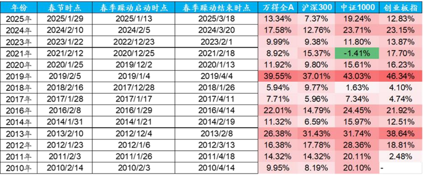 比照历史数据,2026年的“春季躁动”大概率演绎为“强躁动”。同时需要注意的是,2026年春节在2月17日,相比往年较晚,这就相应压缩了全国两会前的上涨时间窗口,因此市场存在提前发动“春季躁动”行情的可能。