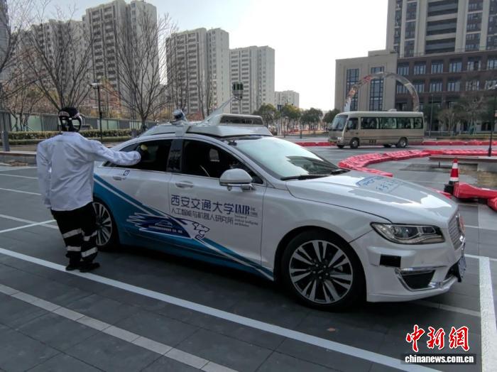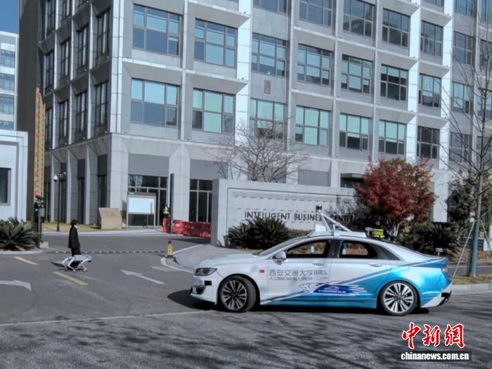 智能车等待“遛狗”的机器人过马路。中新网记者钟升摄