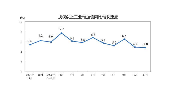 中新网12月15日电据国家统计局网站消息,11月份,规模以上工业增加值同比实际增长4.8%(增加值增速均为扣除价格因素的实际增长率)。从环比看,11月份,规模以上工业增加值比上月增长0.44%。1—11月份,规模以上工业增加值同比增长6.0%。