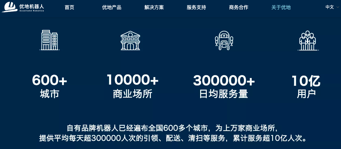 官网资料显示,优地机器人2013年正式成立,获UT斯达康天使轮投资。2014年,成为NVIDIA合作伙伴,为众多客户提供无人驾驶平台解决方案。2016年,获得新恒基和科大讯飞的数千万A轮融资;发布室内配送机器人“优小妹;获批深圳市和国家高新技术企业。2017年,发布室内配送机器人”优小弟。 公司自有品牌机器人已经遍布全国600多个城市,为上万家商业场所,提供平均每天超300000人次的引领、配送、清扫等服务,累计服务超10亿人次。