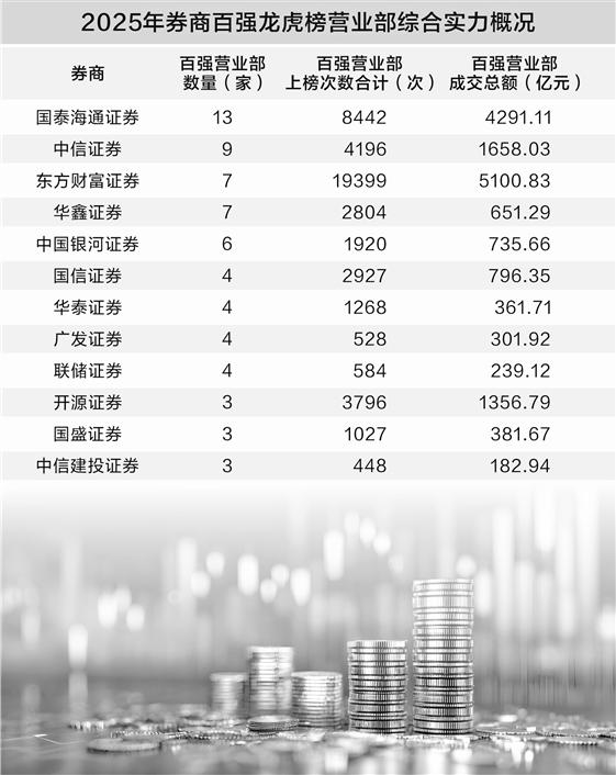 具体来看,国泰海通证券在2025年表现尤为强势,13家百强营业部合计上榜次数达8442次,成交总额高达4291.11亿元,无论是上榜频率还是成交规模均居行业前列。