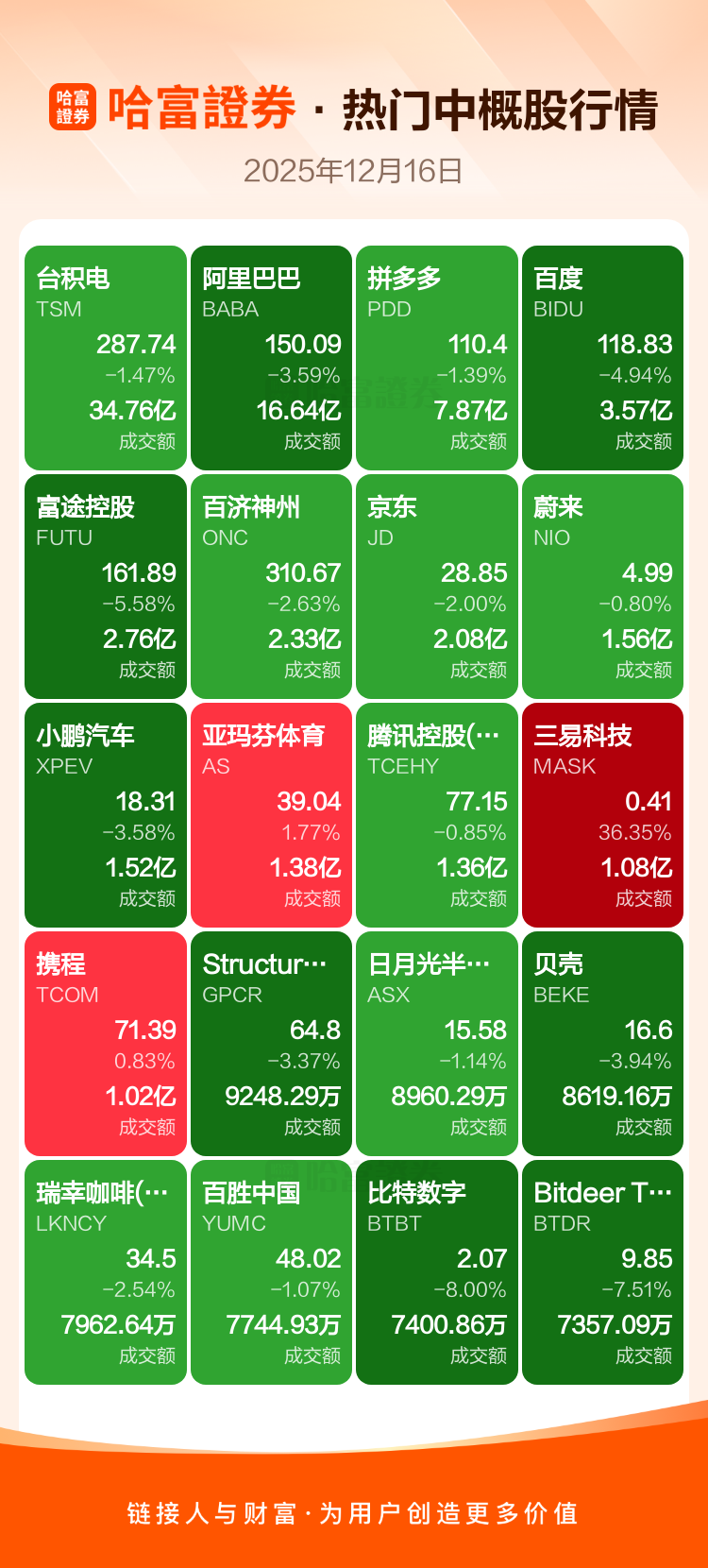 台积电跌1.47%,阿里巴巴跌3.59%,拼多多跌1.39%,百度跌4.94%,富途控股跌5.58%,百济神州跌2.63%,京东跌2.00%,蔚来跌0.80%,小鹏汽车跌3.58%,亚玛芬体育涨1.77%。
