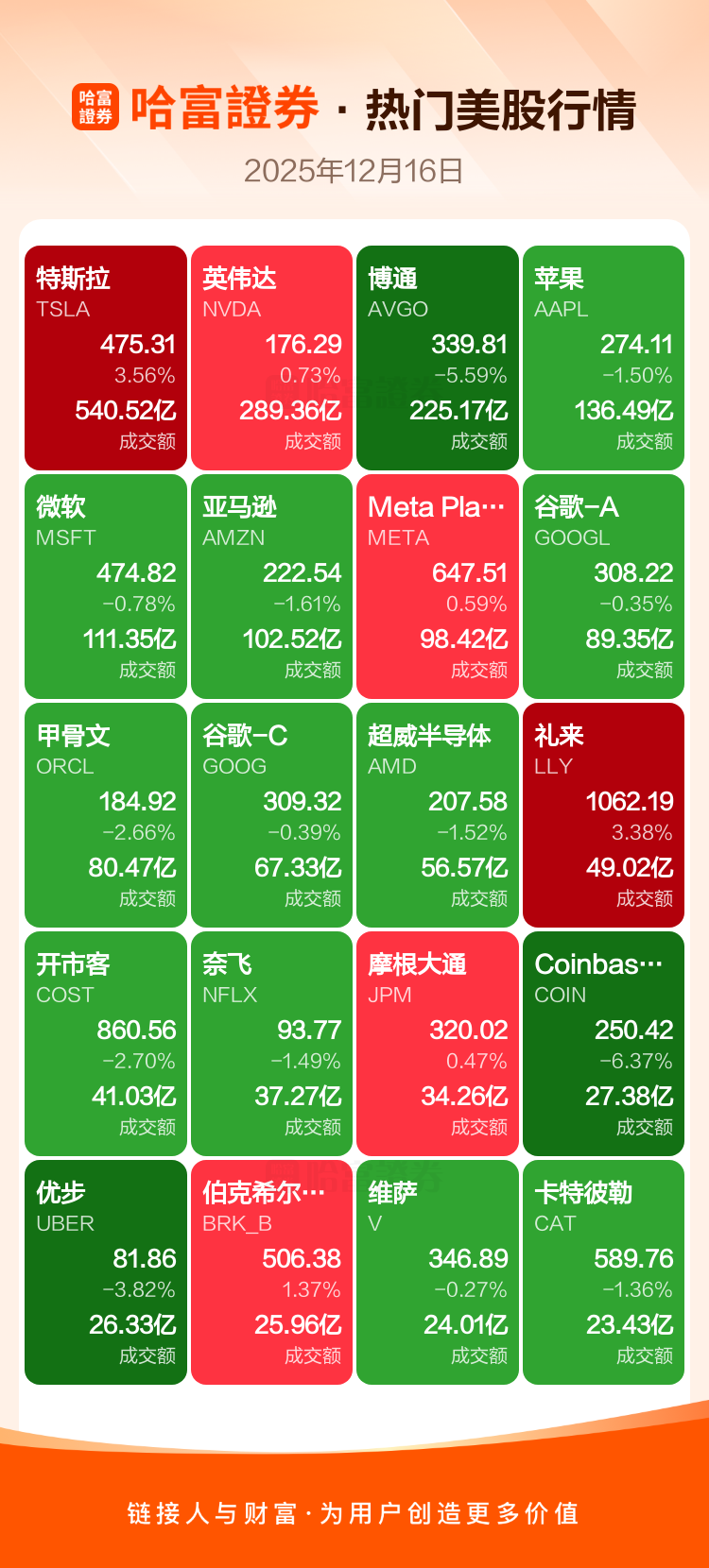 特斯拉涨3.56%,英伟达涨0.73%,博通跌5.59%,苹果跌1.50%,微软跌0.78%,亚马逊跌1.61%,Meta Platforms Inc-A涨0.59%,谷歌-A跌0.35%,甲骨文跌2.66%,谷歌-C跌0.39%。