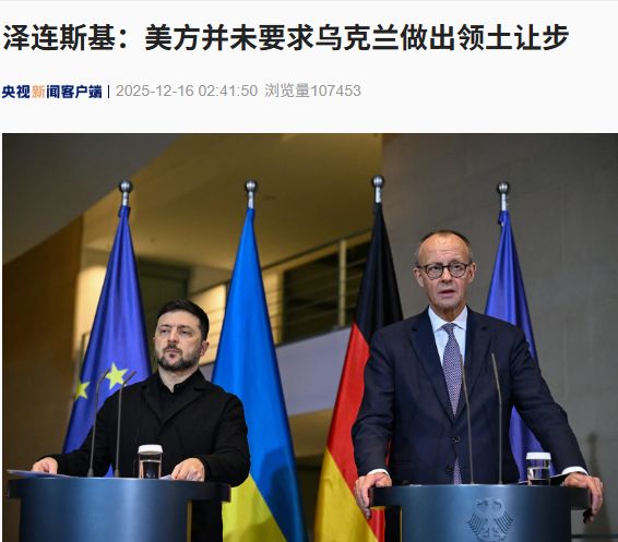 据央视新闻12月16日消息,当地时间12月15日,乌克兰总统泽连斯基与德国总理默茨在柏林举行联合记者会。泽连斯基表示,美国代表团并未就领土让步向乌克兰提出任何要求,而只是转达了俄罗斯的立场。