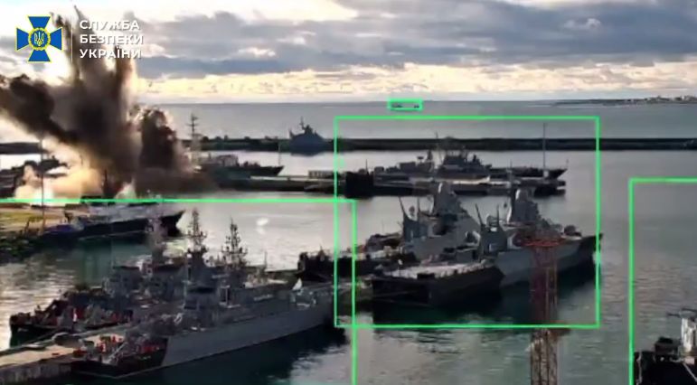 乌国家安全局公布的炸毁俄“华沙女人”级潜艇视频截图。(图片来源:央视新闻)