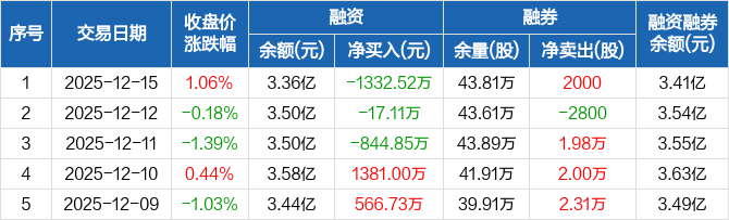 融资方面,当日融资买入597.48万元,融资偿还1930万元,融资净偿还1332.52万元,连续3日净偿还累计2194.48万元。融券方面,融券卖出8400股,融券偿还6400股,融券余量43.81万股,融券余额502.5万元。融资融券余额合计3.41亿元。