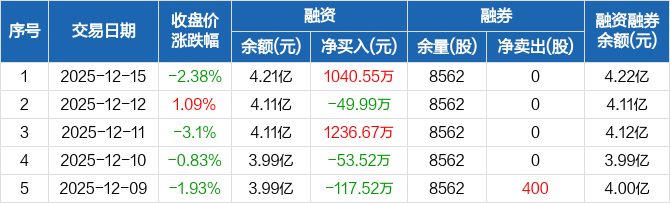 融资方面,当日融资买入2123.5万元,融资偿还1082.95万元,融资净买入1040.55万元。融券方面,融券卖出0股,融券偿还0股,融券余量8562股,融券余额47.86万元。融资融券余额合计4.22亿元。