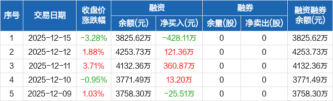 普蕊斯:融资净偿还428.11万元,融资余额3825.62万元(12-15)