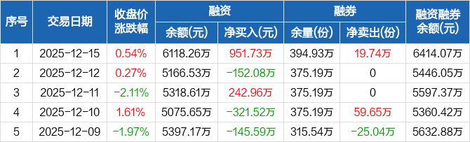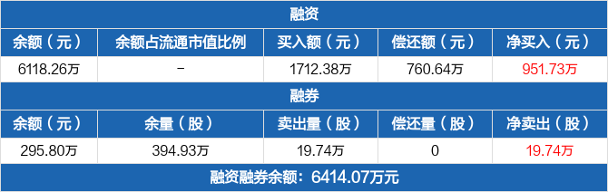 融资方面,当日融资买入1712.38万元,融资偿还760.64万元,融资净买入951.73万元。融券方面,融券卖出19.74万份,融券偿还0份,融券余量394.93万份,融券余额295.8万元。融资融券余额合计6414.07万元。