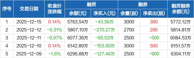 融资方面,当日融资买入99.32万元,融资偿还142.88万元,融资净偿还43.56万元,连续6日净偿还累计681.08万元。融券方面,融券卖出300股,融券偿还0股,融券余量3000股,融券余额8.58万元。融资融券余额合计5772.12万元。