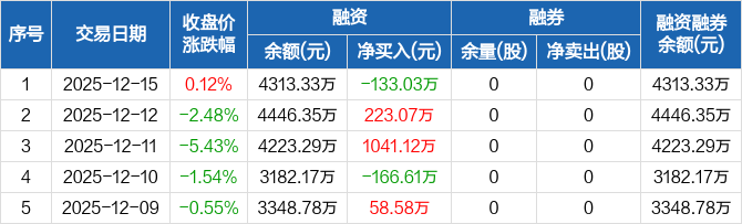 科瑞思:融资净偿还133.03万元,融资余额4313.33万元(12-15)