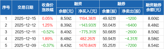 融资方面,当日融资买入4679.27万元,融资偿还3514.89万元,融资净买入1164.38万元。融券方面,融券卖出1.03万股,融券偿还1.15万股,融券余量49.92万股,融券余额974.44万元。融资融券余额合计8.6亿元。