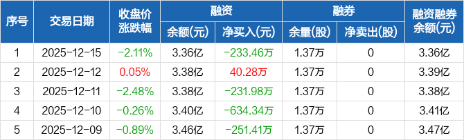 成飞集成:融资净偿还233.46万元,融资余额3.36亿元(12-15)