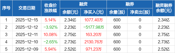 融资方面,当日融资买入1.06亿元,融资偿还9516.87万元,融资净买入1077.4万元。融券方面,融券卖出0股,融券偿还0股,融券余量600股,融券余额4170元。融资融券余额合计2.34亿元。