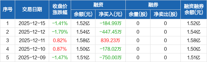 津荣天宇:融资净偿还184.99万元,融资余额1.52亿元(12-15)