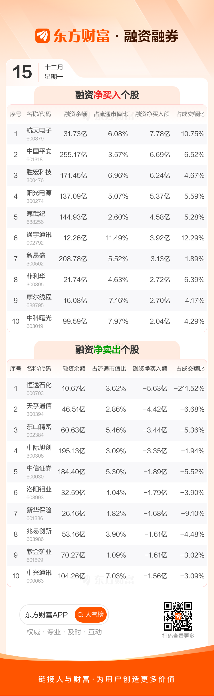 航天电子为当日融资净买入最多个股,为7.78亿,中国平安融资净买入6.69亿,胜宏科技6.24亿。
