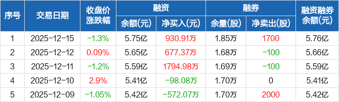 融资方面,当日融资买入2382.58万元,融资偿还1451.67万元,融资净买入930.91万元,连续3日净买入累计3403.25万元。融券方面,融券卖出2100股,融券偿还400股,融券余量1.85万股,融券余额98.11万元。融资融券余额合计5.76亿元。