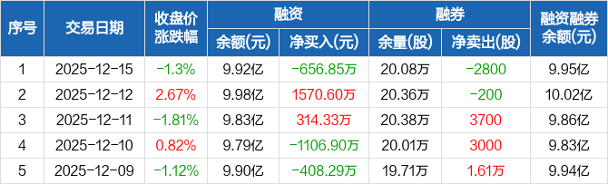 融资方面,当日融资买入4629.52万元,融资偿还5286.37万元,融资净偿还656.85万元。融券方面,融券卖出1.85万股,融券偿还2.13万股,融券余量20.08万股,融券余额320.28万元。融资融券余额合计9.95亿元。