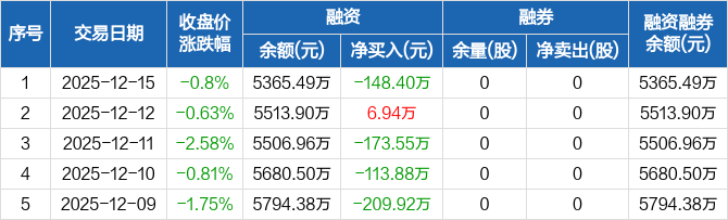 融资方面,当日融资买入183.48万元,融资偿还331.89万元,融资净偿还148.4万元。融券方面,融券卖出0股,融券偿还0股,融券余量0股,融券余额0元。融资融券余额合计5365.49万元。
